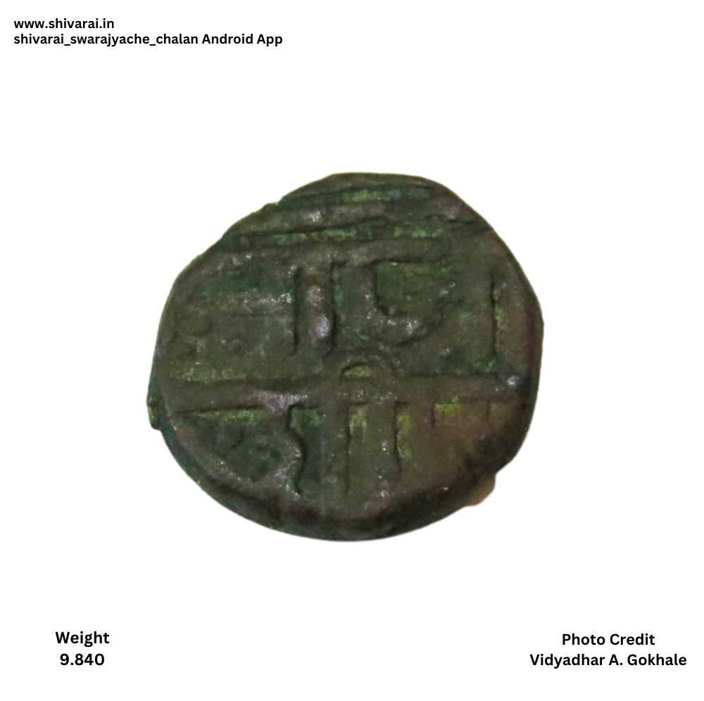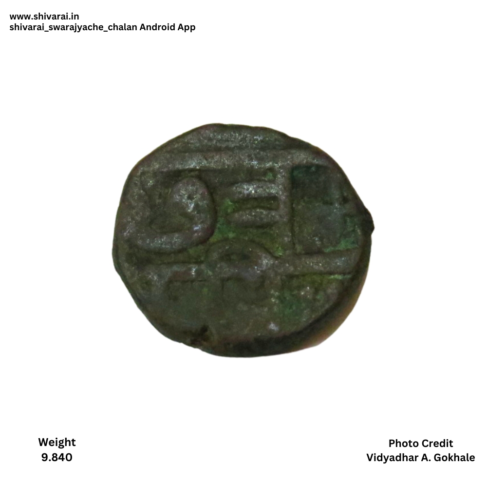 नमुना ९, शीउ लिखाण असलेली दुदांडी नमुन्याची शिवराई. श ला दुसरी वेलांटी, उ पहिला असून नमुना १ प्रमाणे उ ची खालील रेषा शीर्ष रेषेला चिकटलेली. राजा आधी तीन डॉट्स असून छत्र नंतर अधिक चिन्ह आहे.