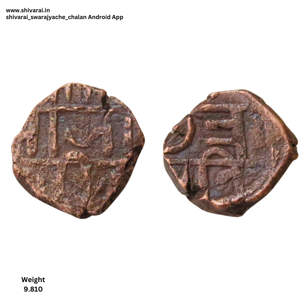आयताकृती शिवराई शिवराईचा आयात आकार. छत्रपती भोवती जपमाळ नमुन्याची बॉर्डर. दोन्ही बाजू स्पष्ट आणि ठळक. नाणे फोटो प्रमाणे.