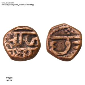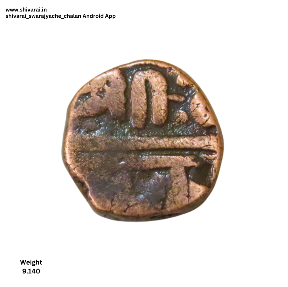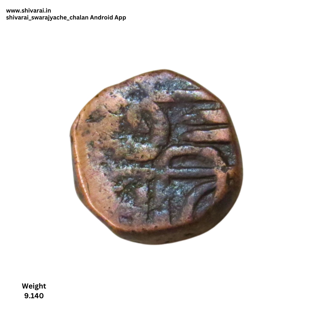 तलवार आणि कमळ चिन्हांकित शिवराई. श्री आधी सुंदर तलवार चिन्ह त्याच्या वरील बाजूस चार नाजूक डॉट्स ची रचना. छत्र नंतर कमळ चिन्ह. ति नंतर तीन डॉट्स.
