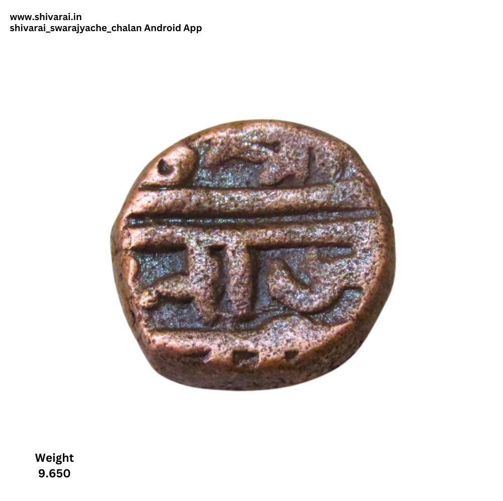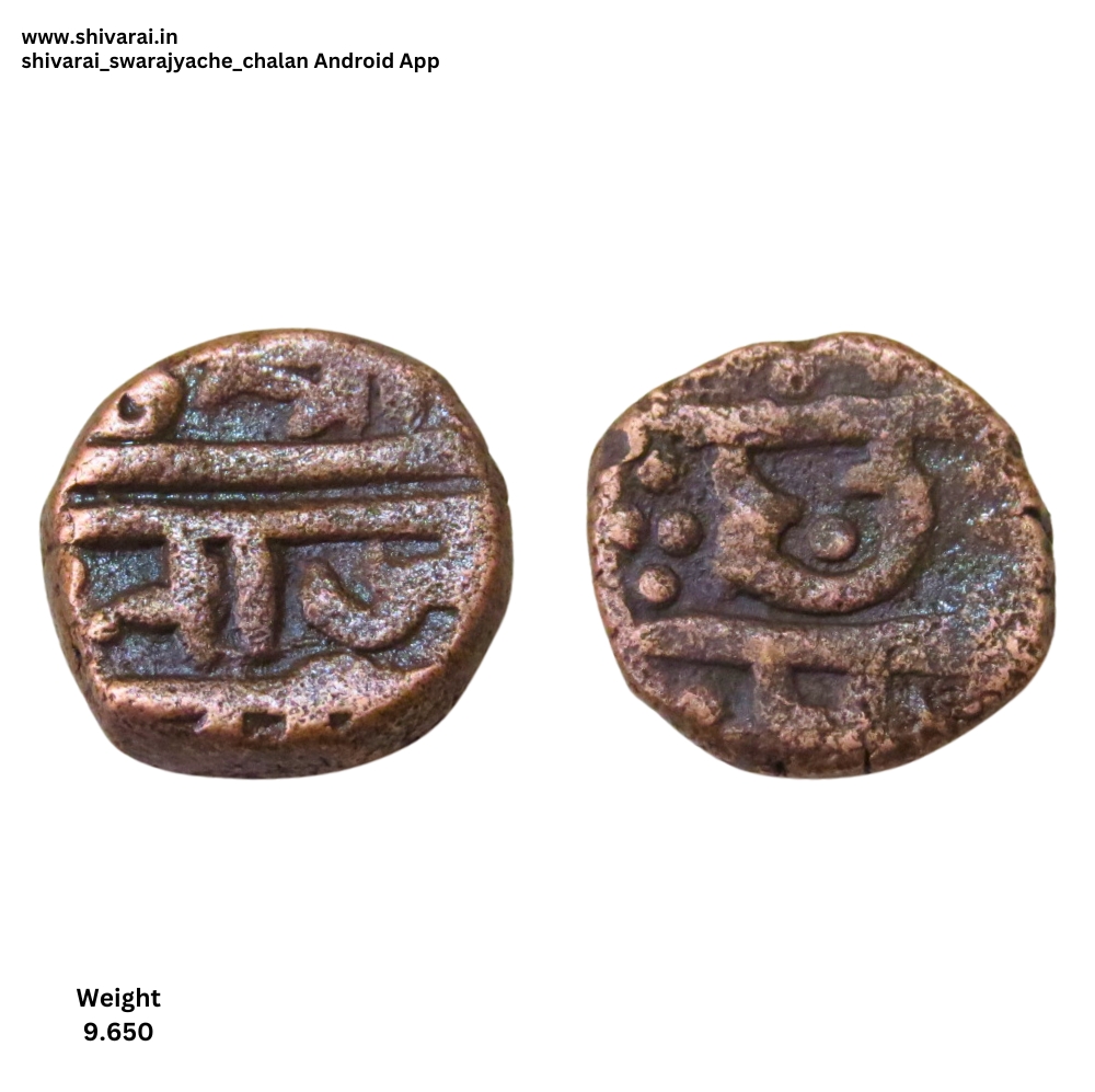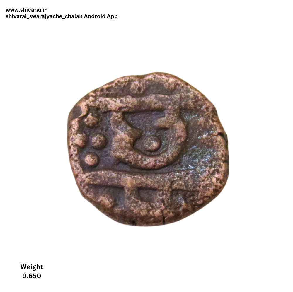 श्री आधी पोकळ गोल, सूर्य चिन्ह. छ आधी चार डॉट्स ची नक्षी, छ च्या पोटात एक डॉट. दोन्ही बाजू स्पष्ट आणि ठळक.