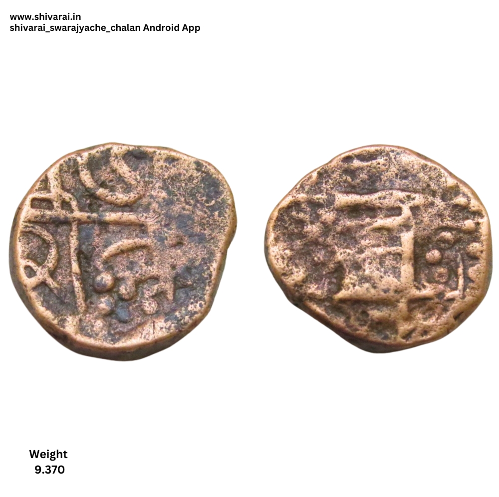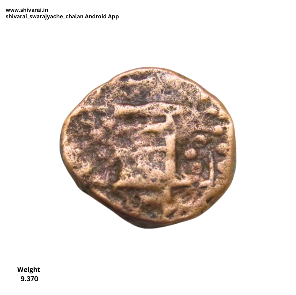 तलवार आणि कमळ चिन्हांकित शिवराई. श्री आधी सुंदर तलवार चिन्ह त्याच्या वरील बाजूस चार नाजूक डॉट्स ची रचना. छत्र नंतर कमळ चिन्ह. ति नंतर तीन डॉट्स.