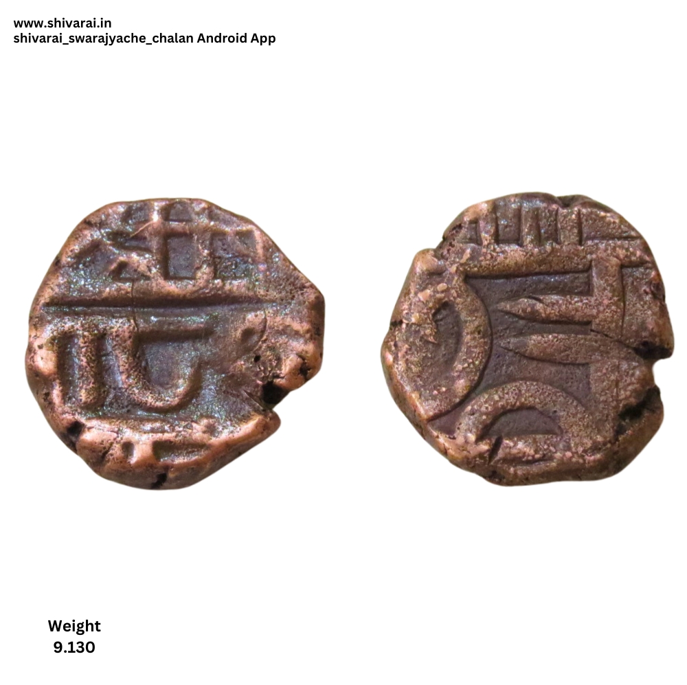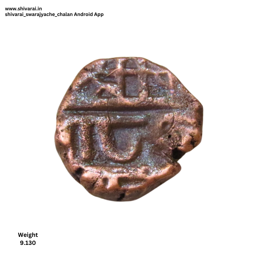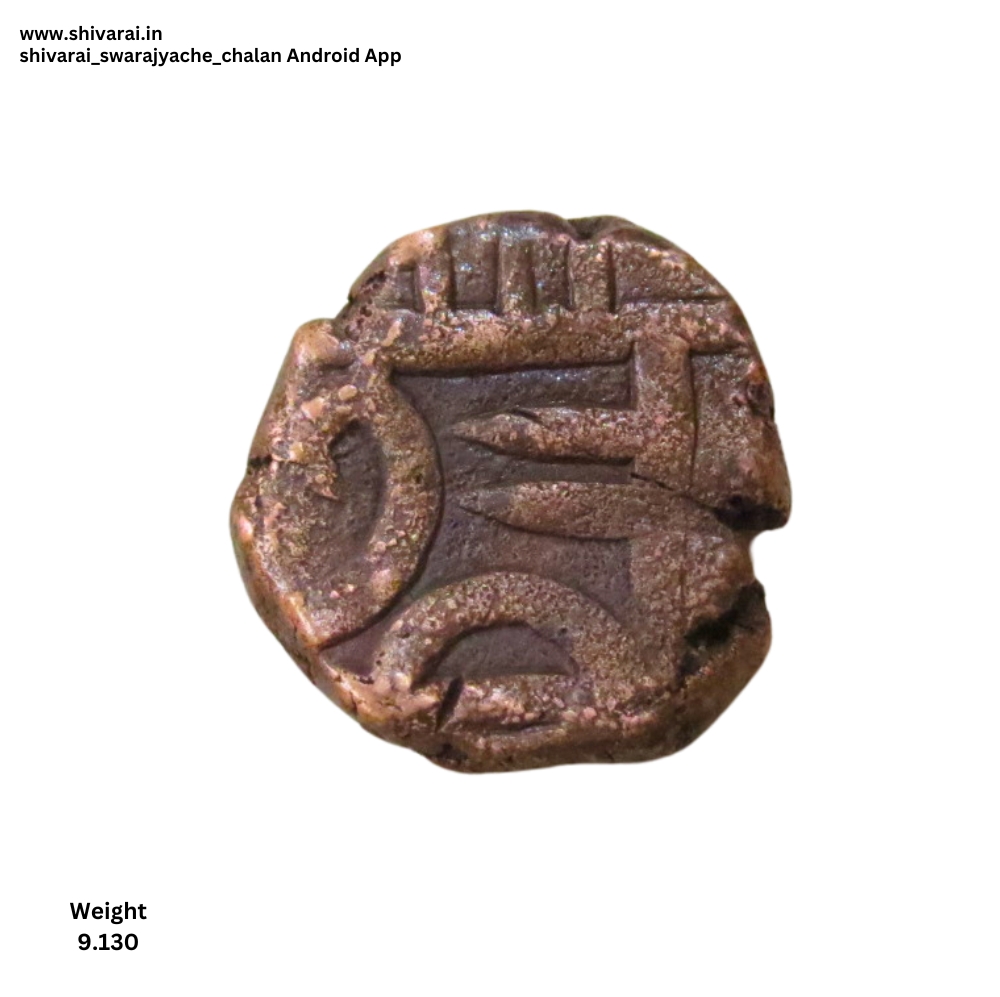 तलवार आणि कमळ चिन्हांकित शिवराई. श्री आधी सुंदर तलवार चिन्ह त्याच्या वरील बाजूस चार नाजूक डॉट्स ची रचना. छत्र नंतर कमळ चिन्ह. ति नंतर तीन डॉट्स.