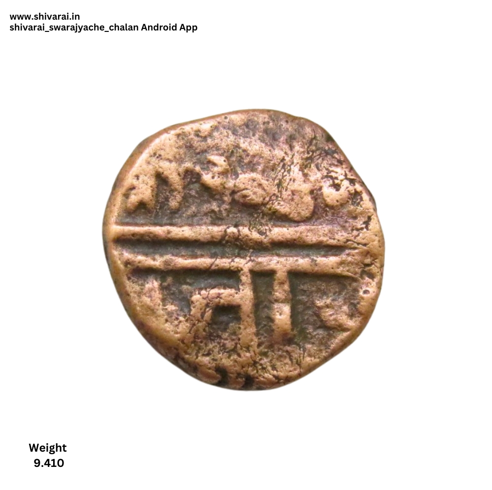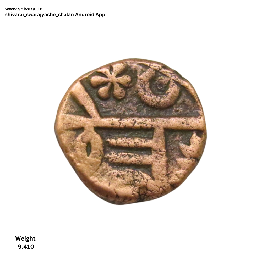 राजा साव नमुन्याची शिवराई. सा चा काही भाग अस्पष्ट असल्याने अक्षर रा सारखे दिसत आहे. छत्र खाली मोठा भरीव डॉट असून, छ आणि त्र परस्परांना चिकटलेले. छत्र च्या वर दुदांडी असण्याची शक्यता. दोन्ही बाजू स्पष्ट आणि ठळक.