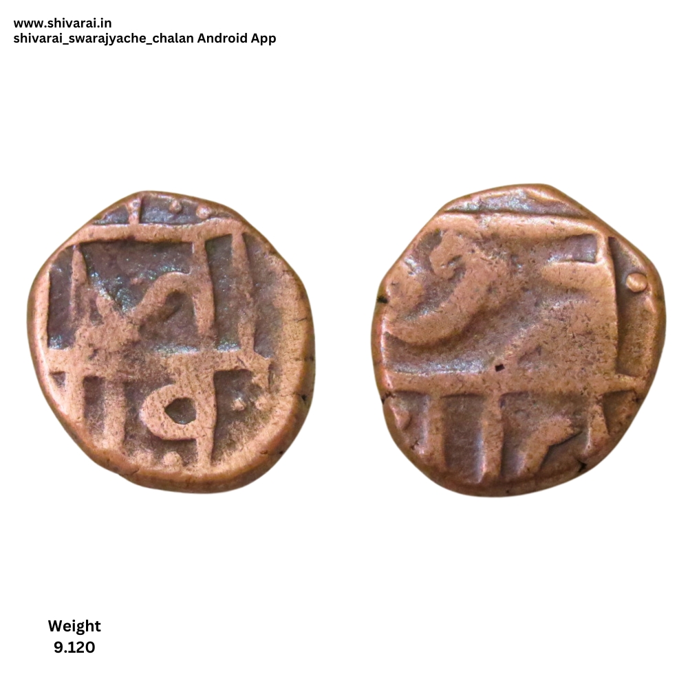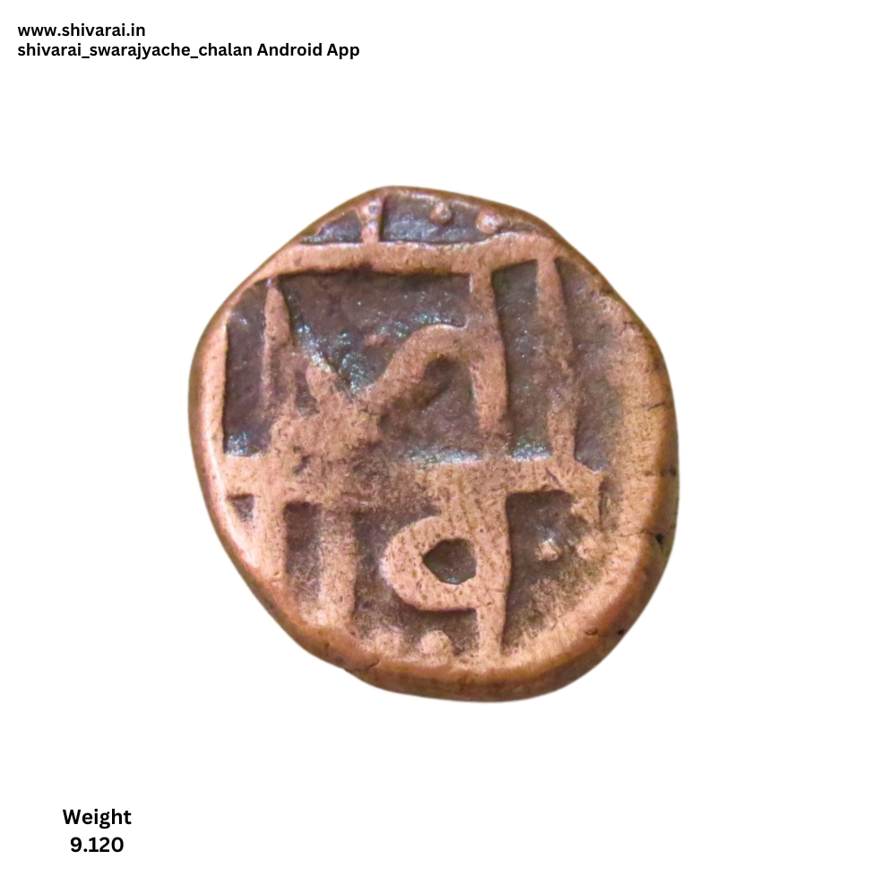 शिवराई तीन लाईन नमुन्यातील शिवराई. जा वळणदार. त ची वेलांटी त्र मध्ये चिकटलेली. दोन्ही बाजू स्पष्ट आणि ठळक. नाणे फोटो प्रमाणे. ग्रॅम : ९.१२०
