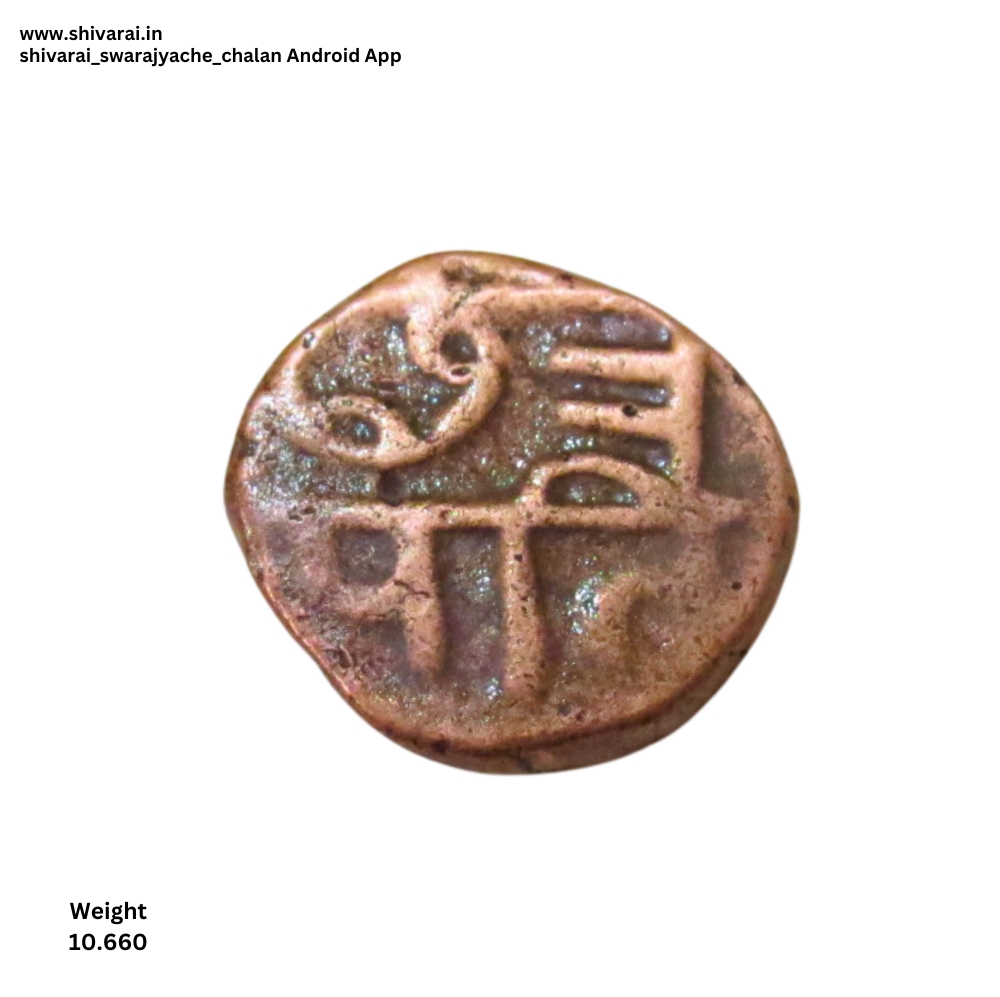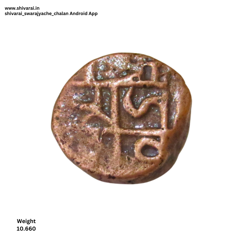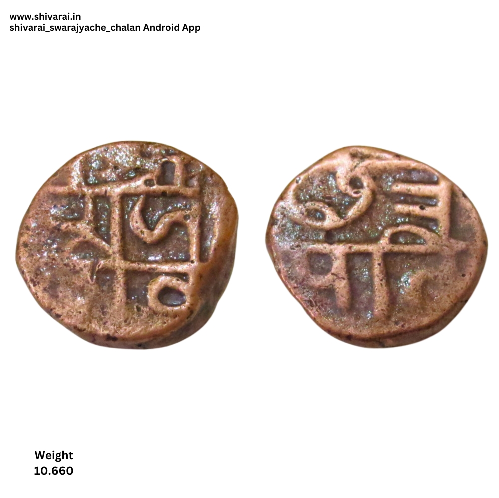देवनागरी श आणि स चे मिश्रण असलेला नमुना. शीव मधील श हा देवनागरी नमुन्यातील असून त्याला स प्रमाणे आडवी रेषा देखील आहे. नाणे काहीसे अस्पष्ट.