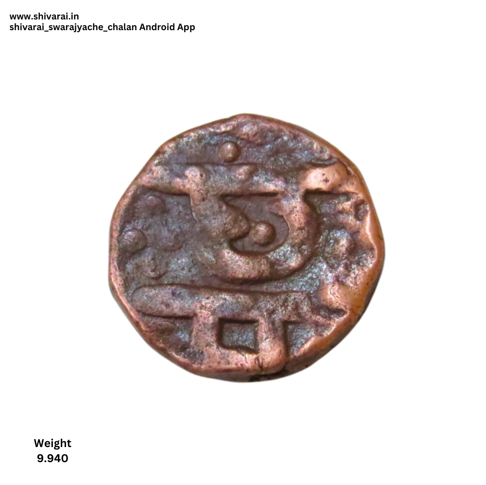 शिवराई वरील पुढील शब्दातील अक्षरे एका ओळीत नसून प्रत्येक अक्षर स्वतंत्र. मागील शब्दातील अक्षरे एका ओळीत. छत्र वर ठिपक्यांचे फुल.
