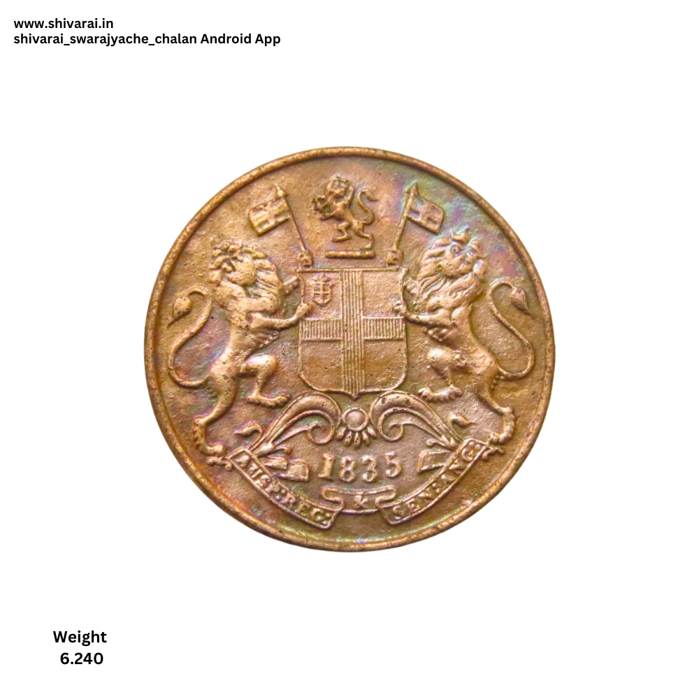 Coat of arms of the East India Company: 2 lions, St George’s cross on the crest and flags, motto on the ribbon “Auspicio Regis et Senatus Angliae” in three parts